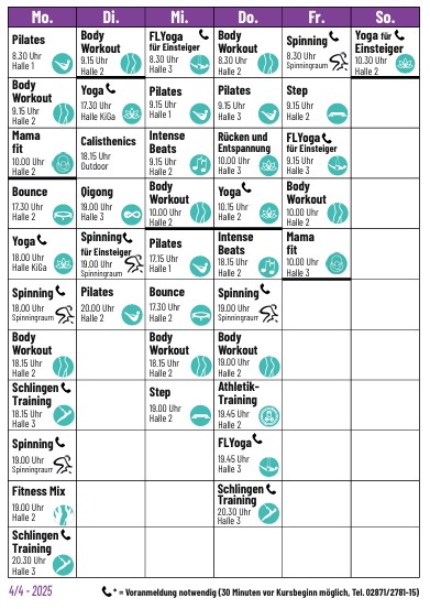 Lassen Sie sich verführen zur Bewegungsvielfalt! Lernen Sie unser breit gefächertes Kursangebot kennen. Sie werden dabei Ihren Körper ganz neu entdecken. Bewegung nach toller Musik, jeweils auf Alters- und Interessengruppen zugeschnitten, macht viel Spaß und in der Gruppe hält man länger durch. Ob Step-Aerobic, Bodyworkout, Fatburner, Bounce&Fun, Spinning, Yoga usw. hier findet jeder einen Kurs nach seinem Geschmack.