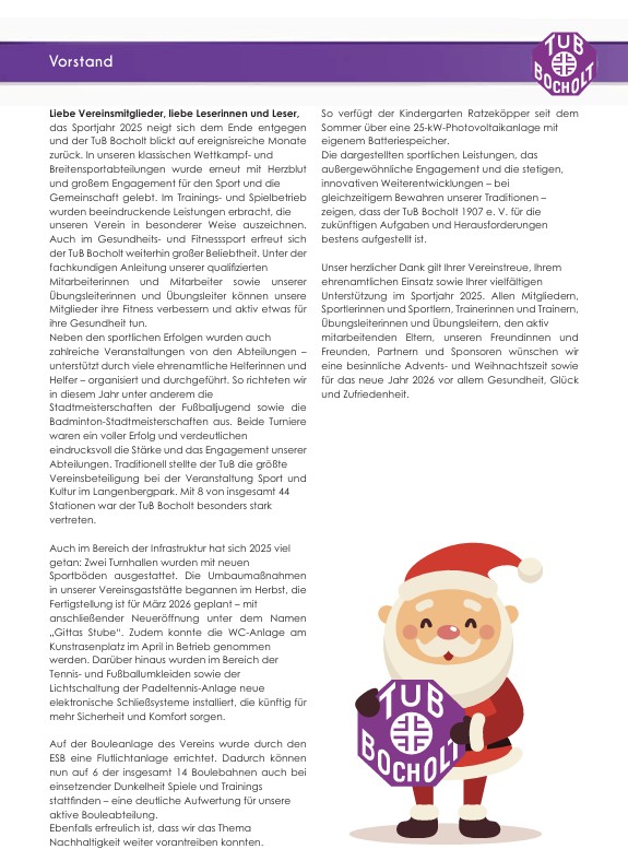 Sport, der zu mir passt. Wöchentlich 300 verschiedene Sportangebote für groß und klein in Bocholt. Vom Eltern-Kindturnen über das Anfängerschwimmen bis zum klassischen Wettkampf-, Fitness- und Gesundheitssport, der TuB Bocholt bietet die besten Rahmenbedingungen und die größte Auswahl für eine aktive Lebensgestaltung und viel Spaß am Sport.