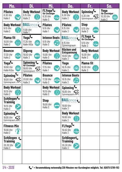 Lassen Sie sich verführen zur Bewegungsvielfalt! Lernen Sie unser breit gefächertes Kursangebot kennen. Sie werden dabei Ihren Körper ganz neu entdecken. Bewegung nach toller Musik, jeweils auf Alters- und Interessengruppen zugeschnitten, macht viel Spaß und in der Gruppe hält man länger durch. Ob Step-Aerobic, Bodyworkout, Fatburner, Bounce&Fun, Spinning, Yoga usw. hier findet jeder einen Kurs nach seinem Geschmack.